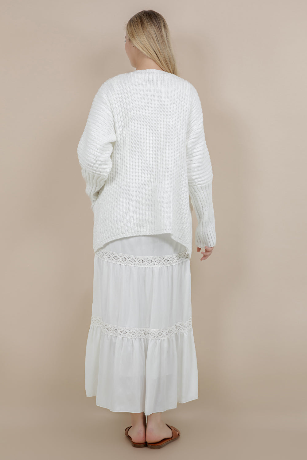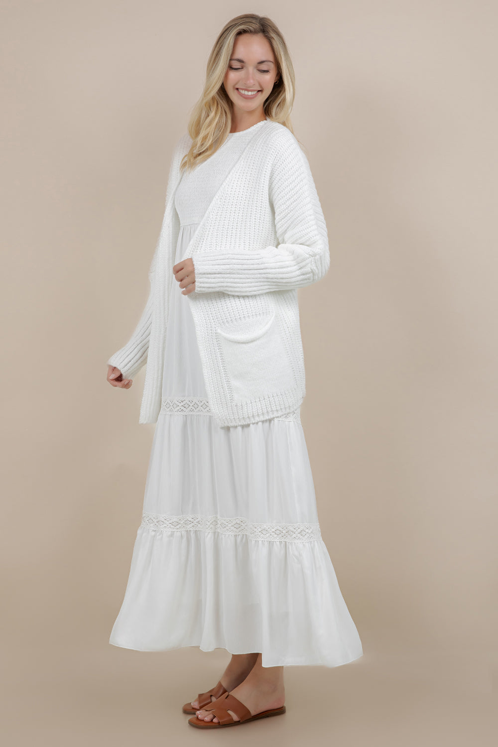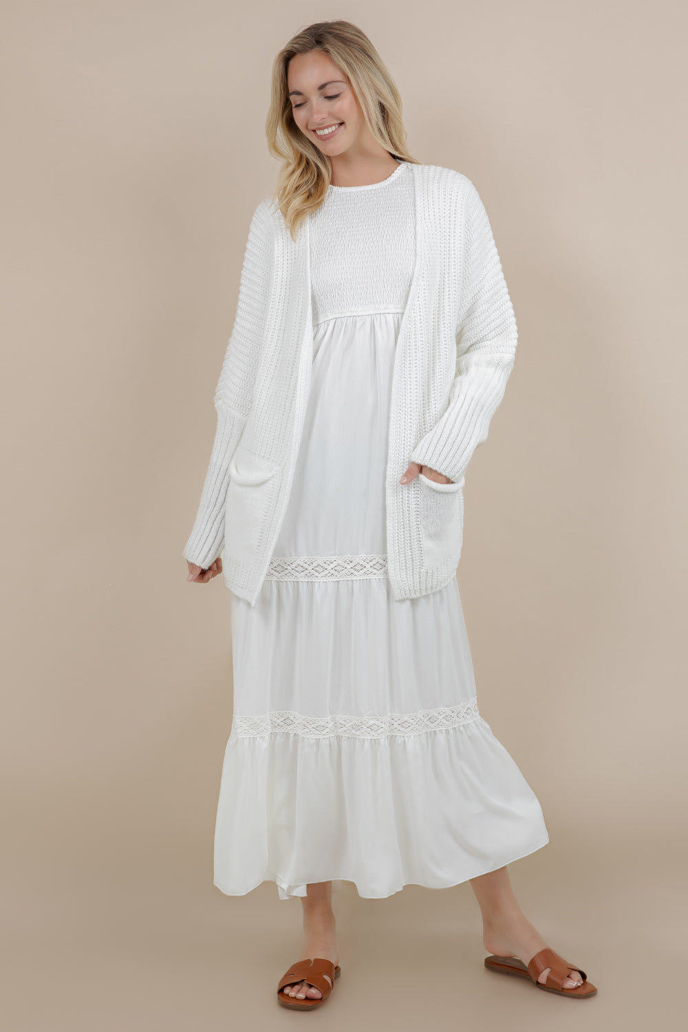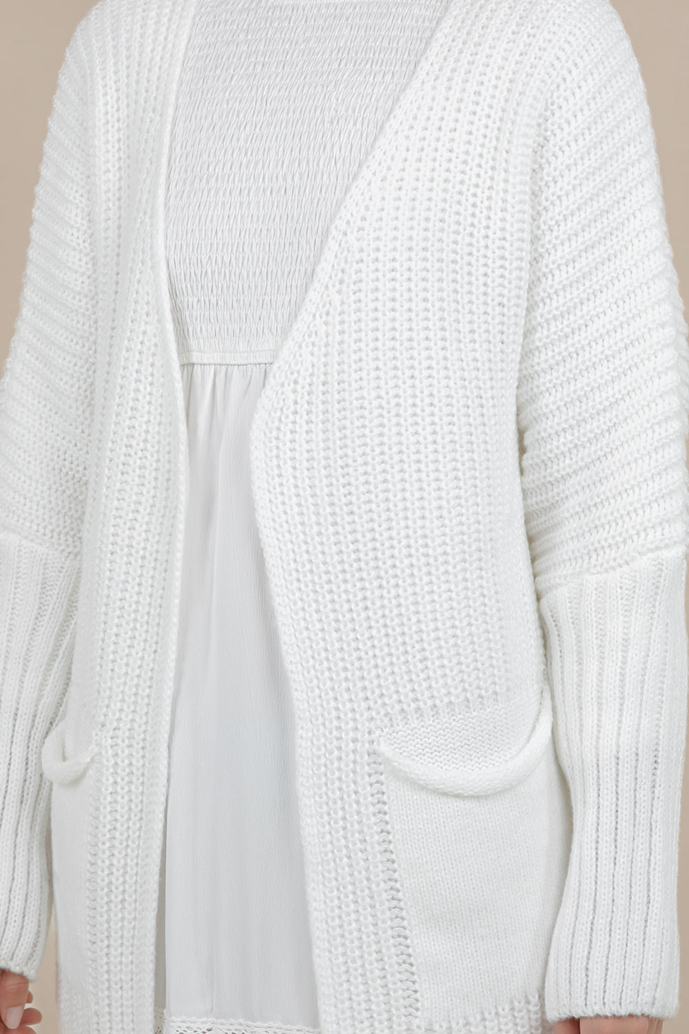 Stay warm in the temple with the Cate Long Cardigan in White. featuring a refined design inspired by classic temple attire. Crafted for comfort and elegance. this cardigan offers convenient pockets. combining practicality with timeless style. Its clean lines and pristine white fabric make it a versatile piece perfect for layering on special occasions or everyday wear.