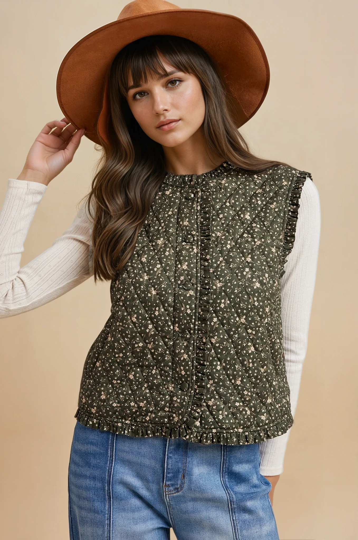 Elevate your layering with the Dailee Floral Quilted Vest. featuring a delicate floral print that adds a timeless touch. This sophisticated piece is enhanced by subtle ruffle details and refined button accents. combining texture and elegance effortlessly. Ideal for cooler days. the quilted design provides warmth while maintaining a polished silhouette.
