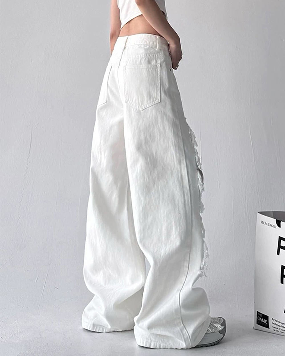 These high-waisted white jeans feature wide-leg design. distressed rips. elegantlyadorned with lace detailing