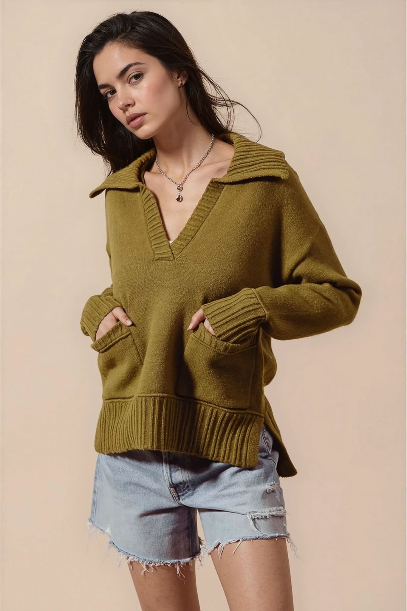 The Sandy Pullover Sweater in Olive features a classic flap collar design paired with practical patch pockets. combining timeless style with everyday functionality. Crafted for versatile layering. its comfortable fit and rich olive tone make it a sophisticated choice for both casual and refined looks. Perfect for cooler days. this sweater provides warmth without sacrificing elegance.
