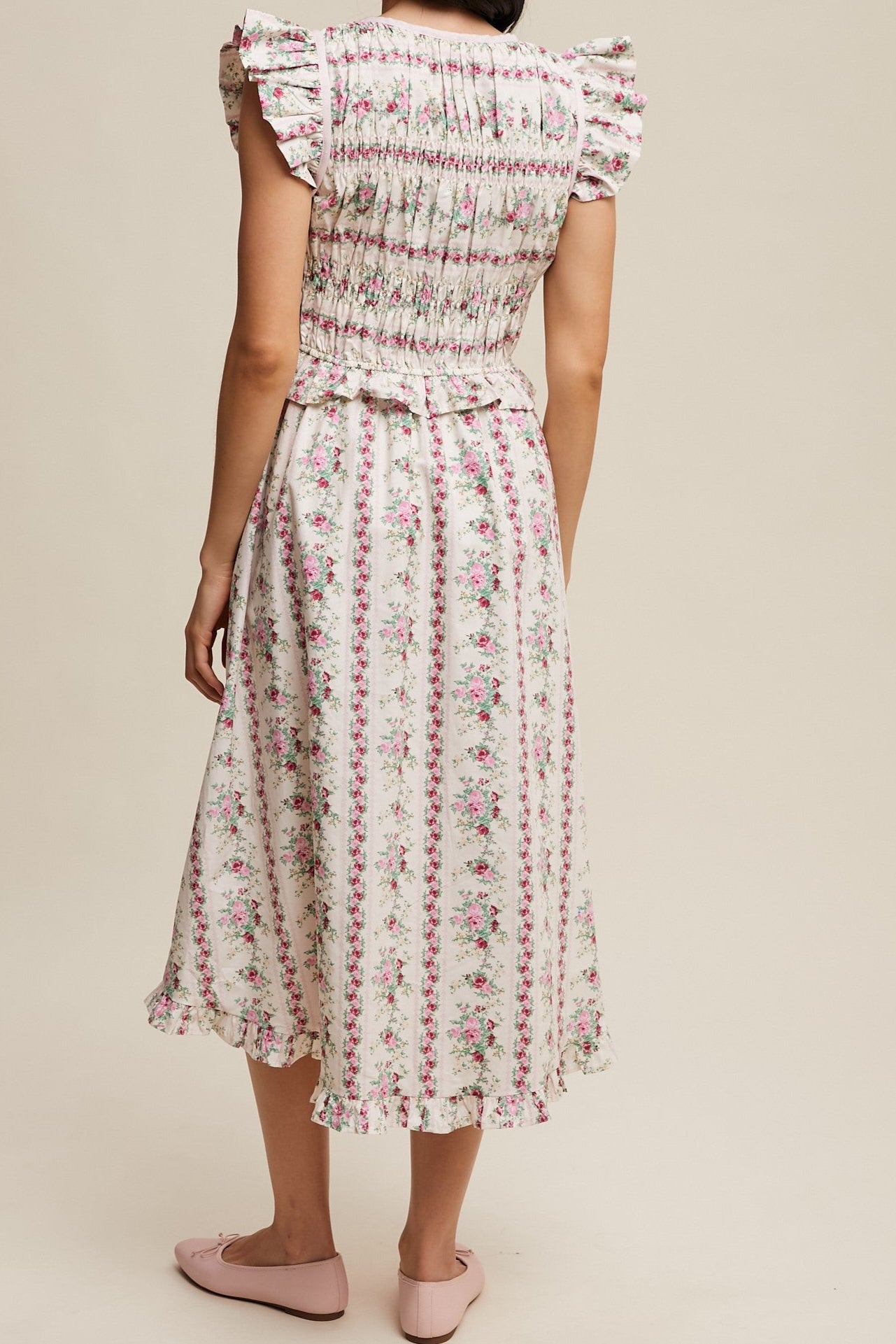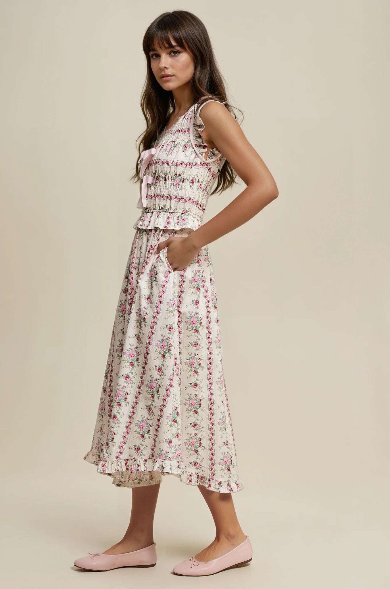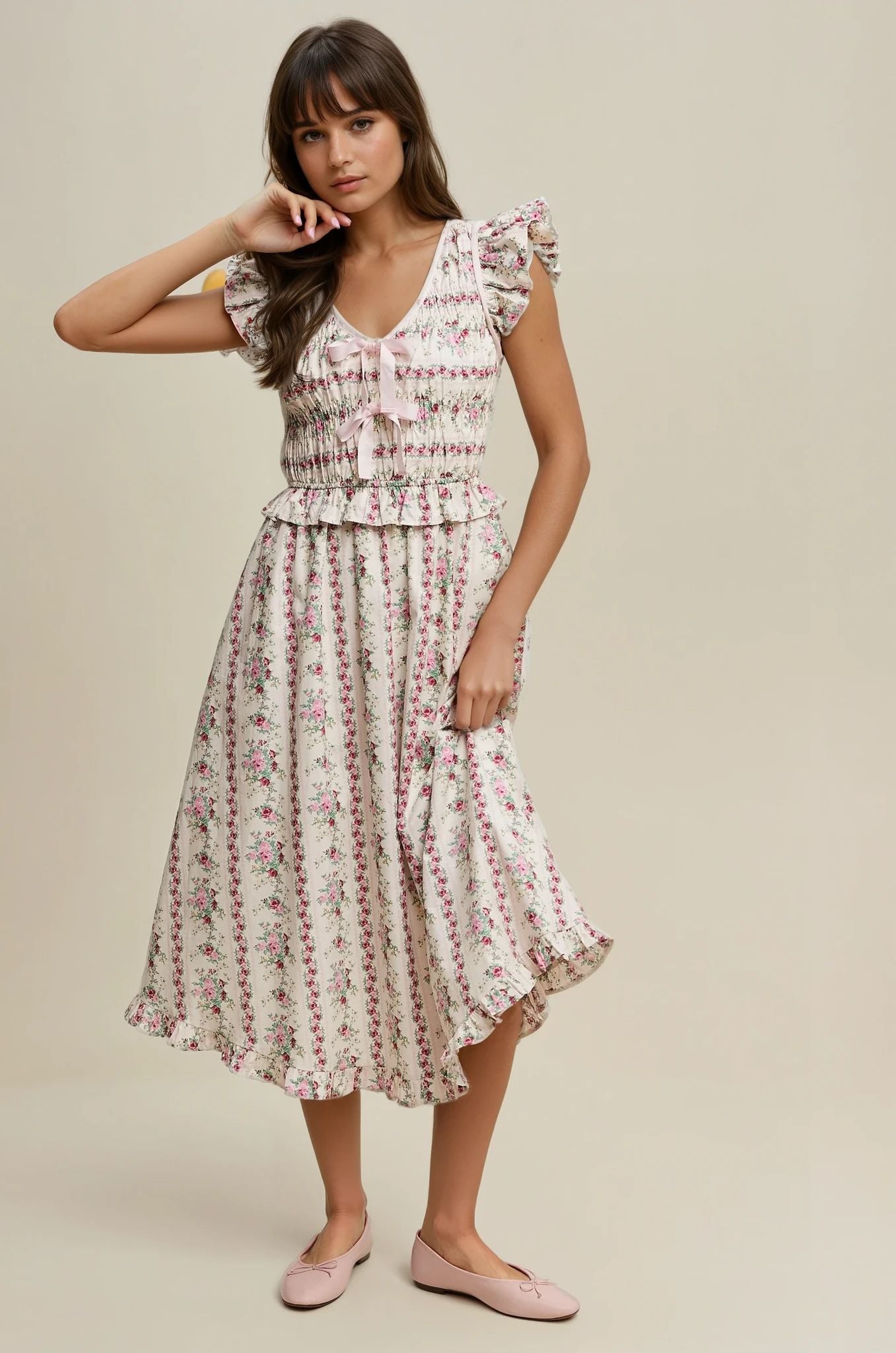 The Savannah Vintage Smocked Dress features a delicate smocked bodice and charming ruffle sleeves. enhanced by an elegant bow detail. Its graceful floral pattern and midi length create a refined summer silhouette. perfect for sophisticated occasions or leisurely days in style.