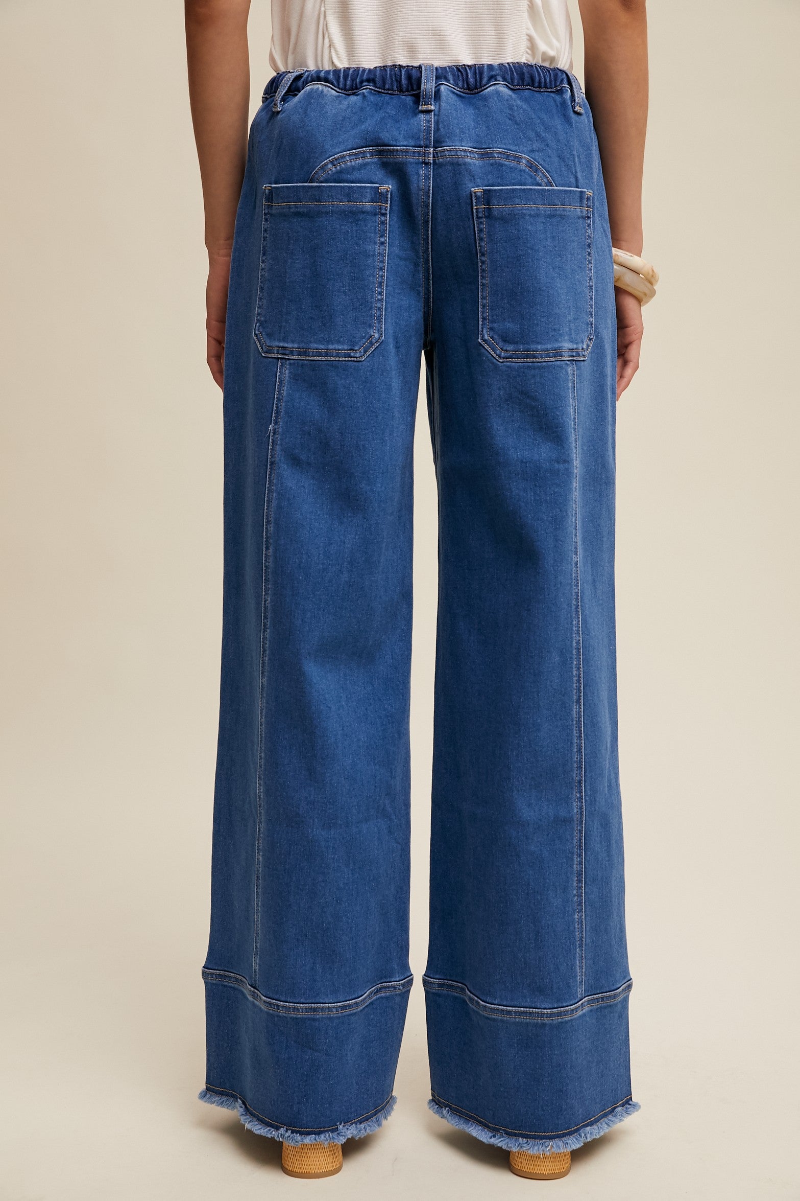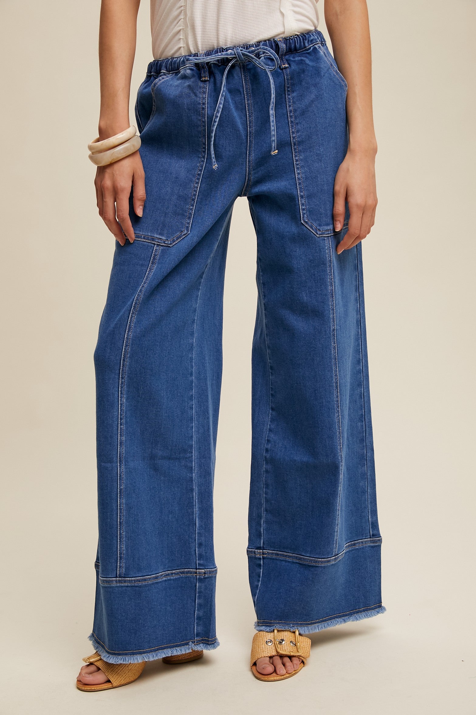 Experience effortless sophistication with the Taya Relaxed Wide-Leg Denim Pants. Crafted from premium denim. they combine durability with softness for all-day comfort. The comfortable elastic waistband with an adjustable drawstring ensures a tailored fit. while oversized patch pockets add both utility and modern style. The wide-leg silhouette offers a graceful. breezy movement. complemented by a raw hem that brings an edgy. contemporary finish to this timeless design. Perfect for those who value both function and refined fashion.