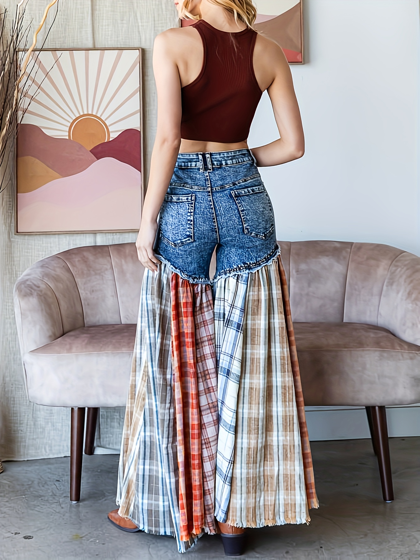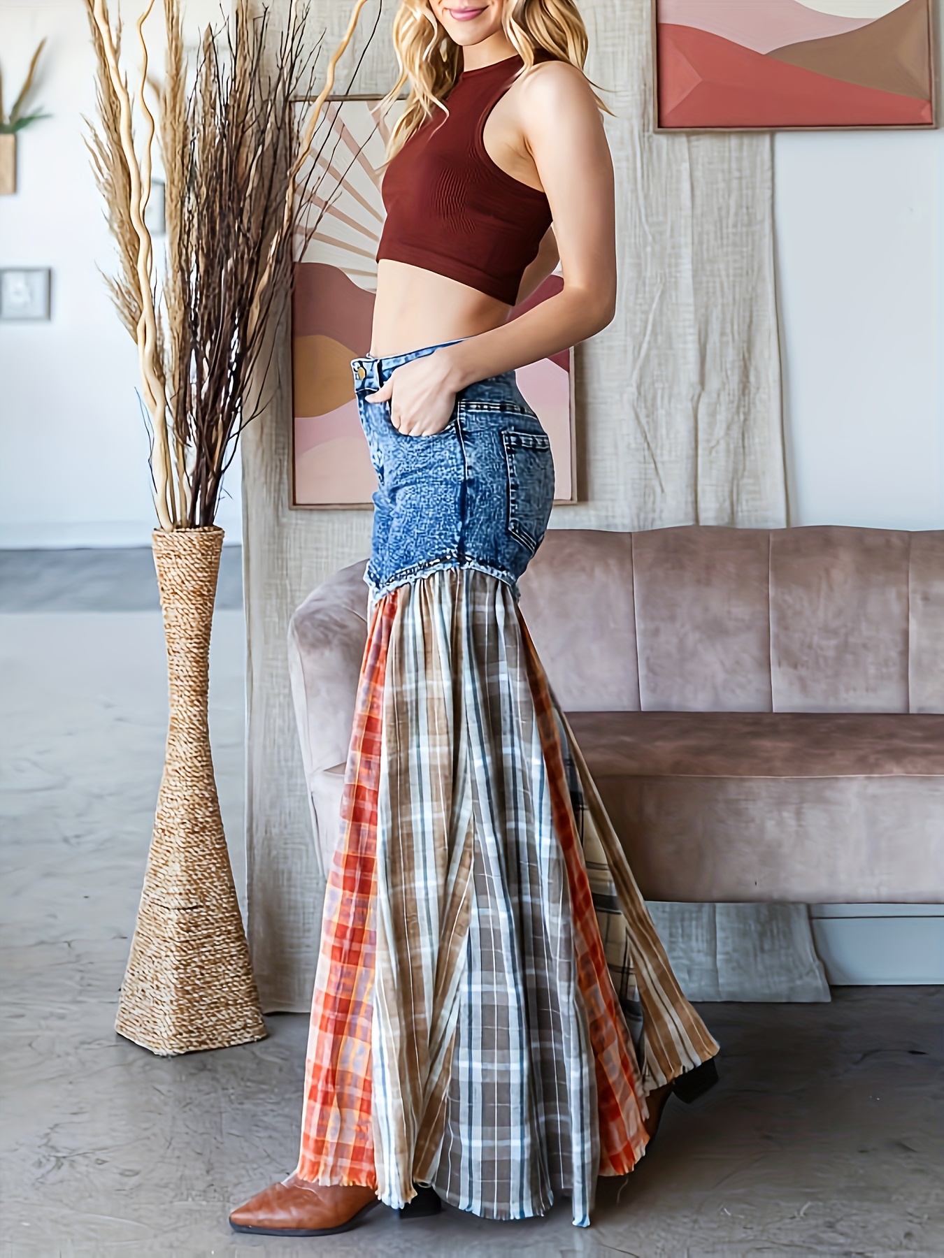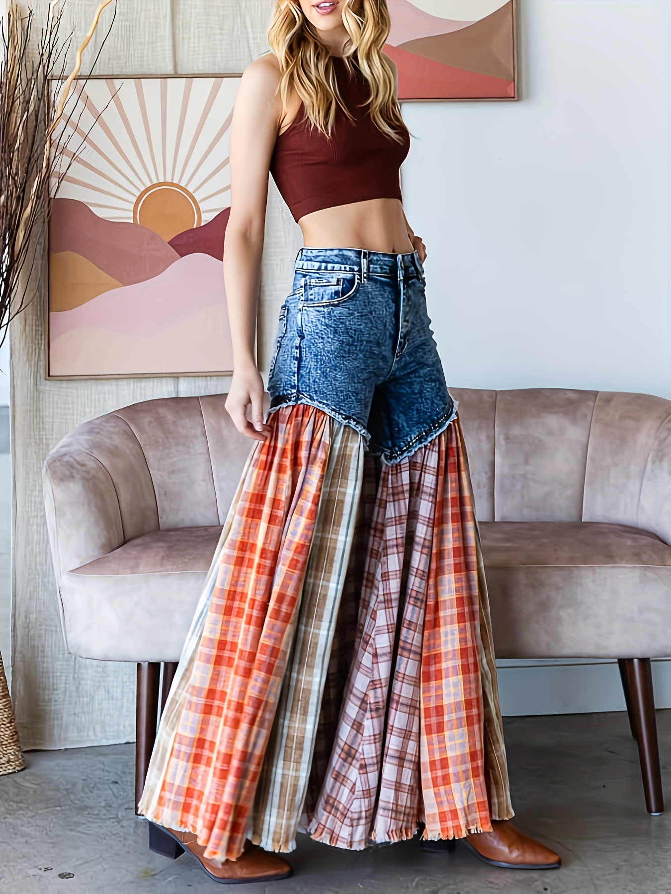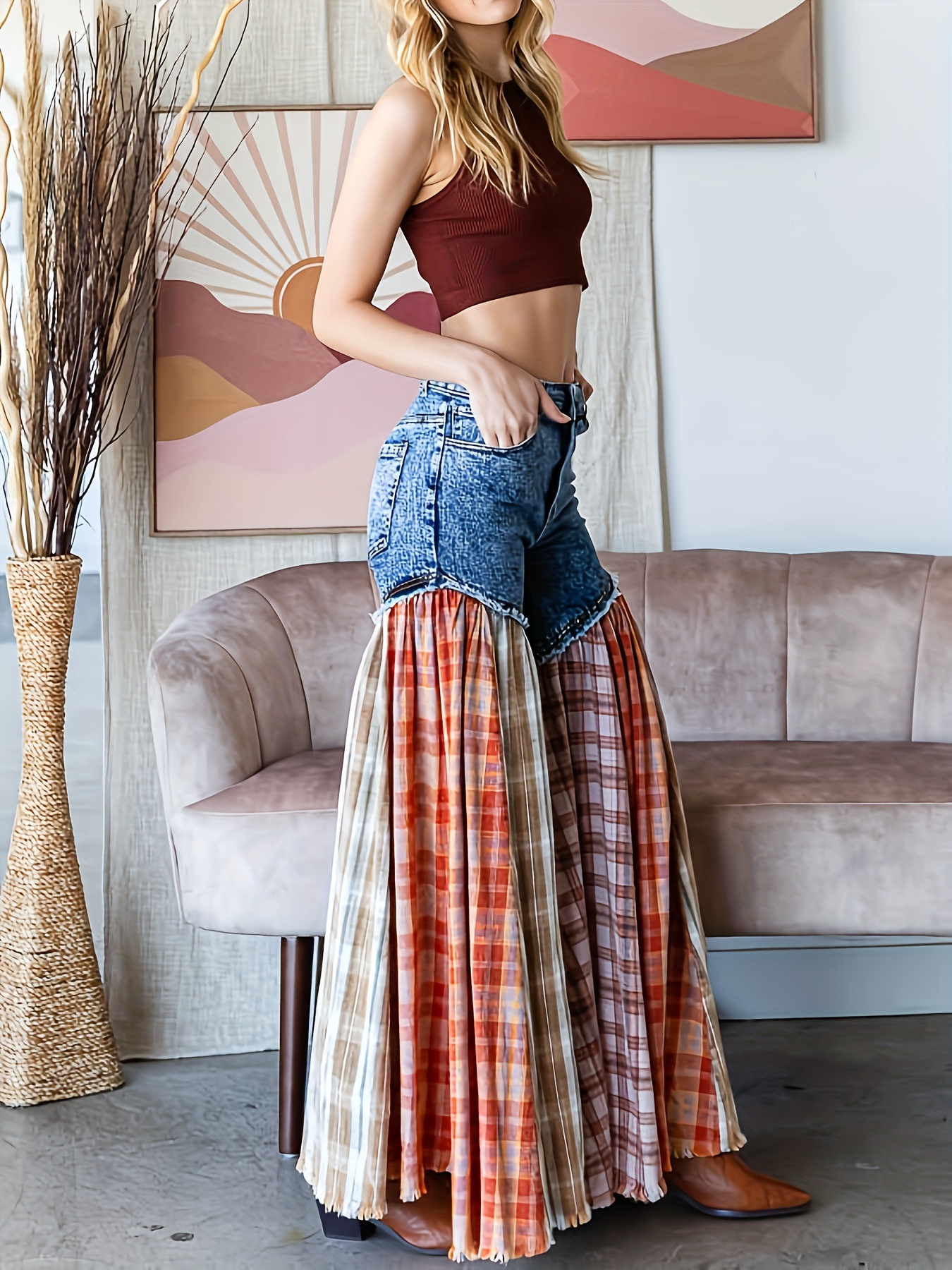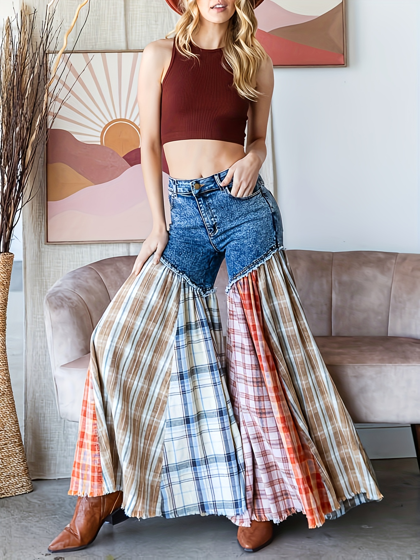 Women’s Denim Patchwork Flared Bell-Bottom Pants with Ruffled Hem – Street Style Casual Trousers, All-Season Regular Fit Length for Everyday Outings, Relaxed Outfit Jeans, Durable Fabric Jeans